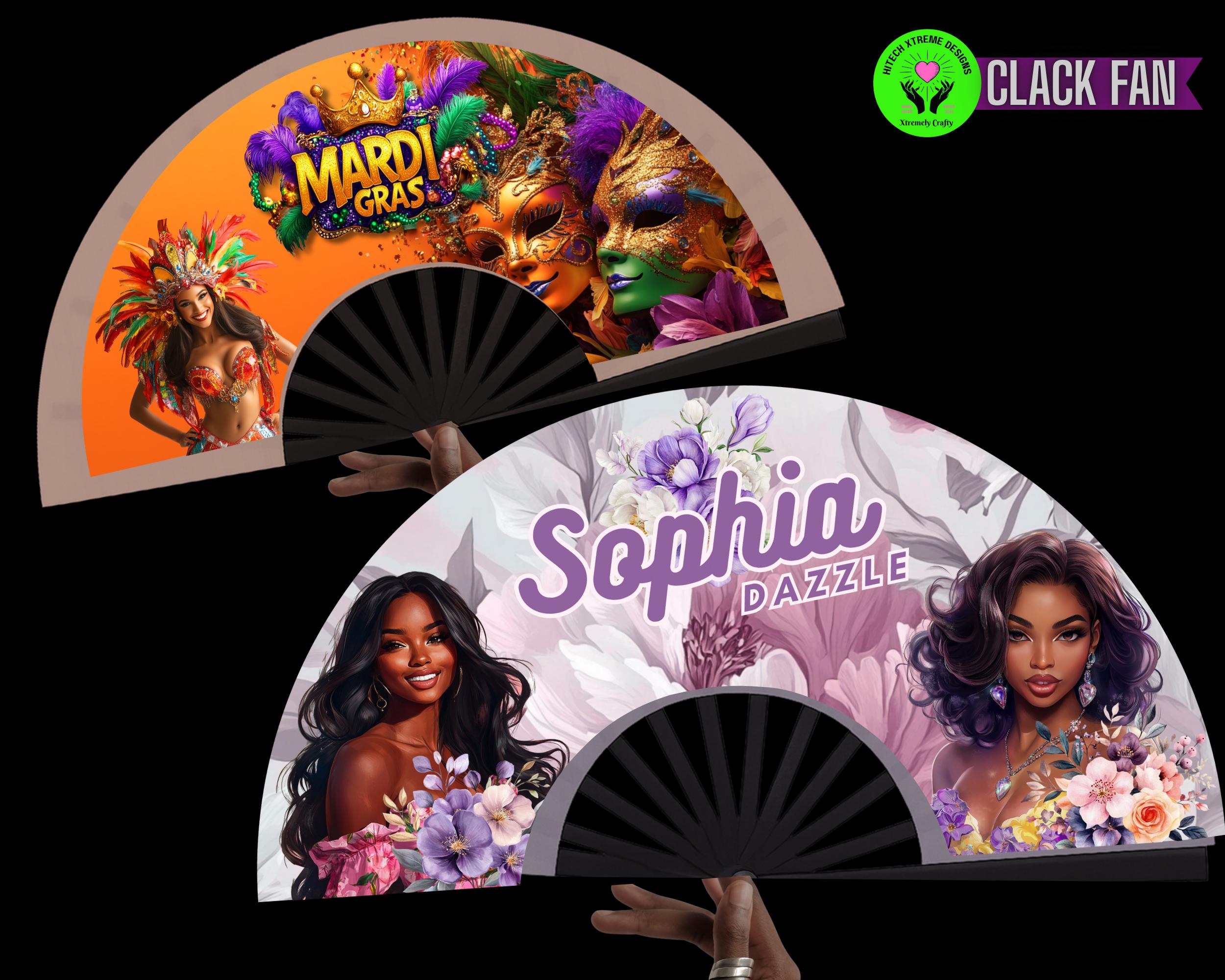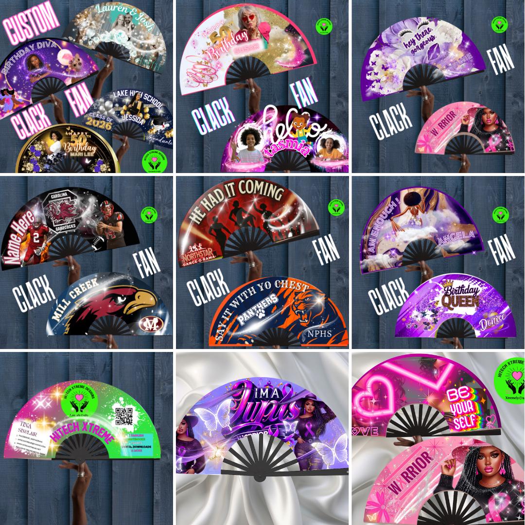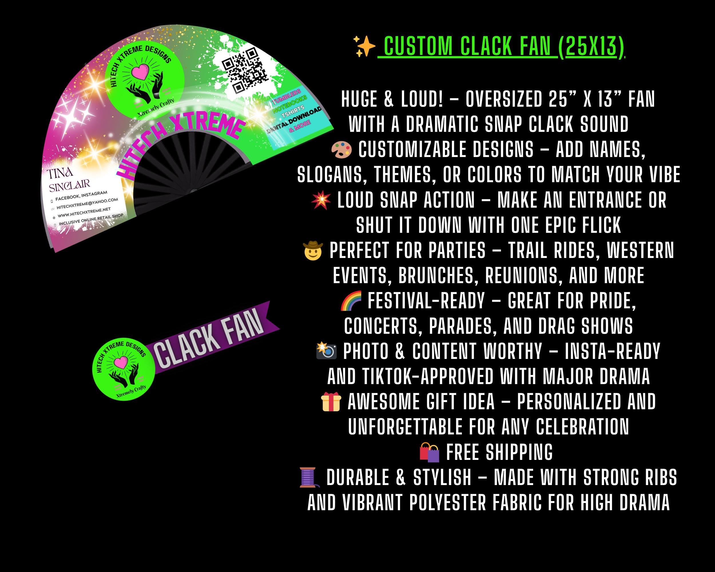 Stand out with a bespoke fan you design! This large 25″×13″ personalized clack fan is perfect for weddings, birthdays, graduations, reunions, events, or memorable gifts. Upload a photo, name, logo or message — and we’ll bring it to life with crisp quality printing.